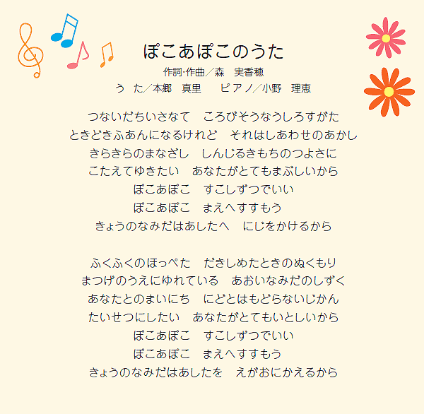ルピナスの会は、毎月1回、別府市の光の園児童館で、童謡を歌ったり、育児について学ぶ母子サークル「ぽこあぽこ」を開催しています。そのオリジナルソングがこの「ぽこあぽこのうた」です。「ぽこあぽこ」は、音楽用語で「少しずつ」という意味です。